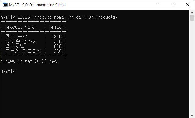 products테이블에서 제품 이름(product_name)과 가격(price)만을 선택하는 쿼리를 작성해주세요.products테이블에서 제품 이름에 '프로'가 포함된 모든 제품을 선택하는 쿼리를 작성해주세요.products테이블에서 제품 이름이 '갤'로 시작하는 모든 제품을 선택하는 쿼리를 작성해주세요.products테이블에서 모든 제품을 구매하기 위해 필요한 돈을 계산하는 쿼리를 작성해주세요.