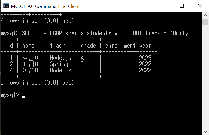 sparta_students테이블에서 Unity 트랙 소속이 아닌 학생들을 선택하는 쿼리를 작성해주세요!