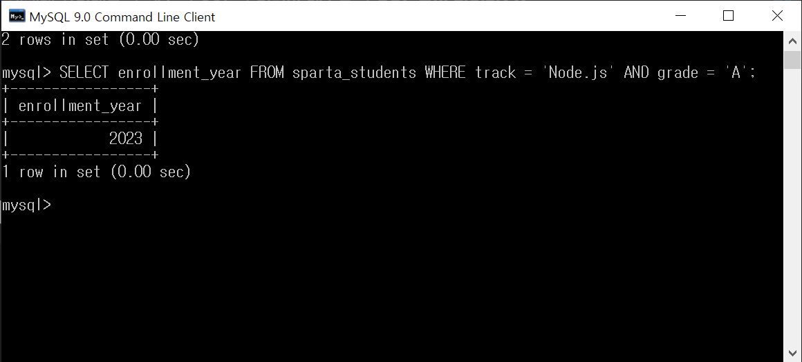 sparta_students테이블에서 Node.js 트랙 소속이고 학점이 ‘A’인 학생의 입학년도를 선택하는 쿼리를 작성해주세요!