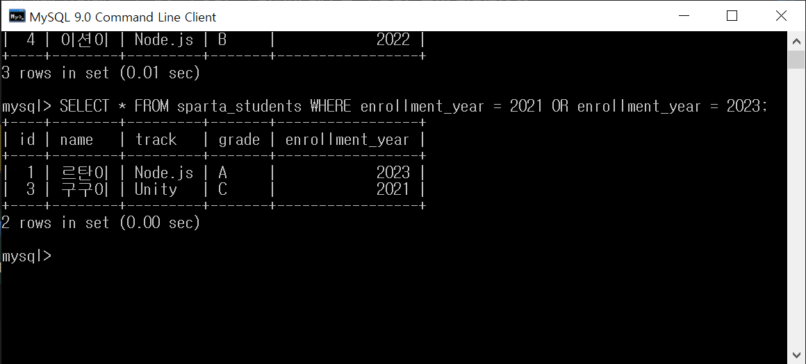 sparta_students테이블에서 모든 학생의 이름(name)과 트랙(track)을 선택하는 쿼리를 작성해주세요!sparta_students테이블에서 Unity 트랙 소속이 아닌 학생들을 선택하는 쿼리를 작성해주세요!sparta_students테이블에서 입학년도(enrollment_year)가 2021년인 학생과 2023년인 학생을 선택하는 쿼리를 작성해주세요!sparta_students테이블에서 Node.js 트랙 소속이고 학점이 ‘A’인 학생의 입학년도를 선택하는 쿼리를 작성해주세요!