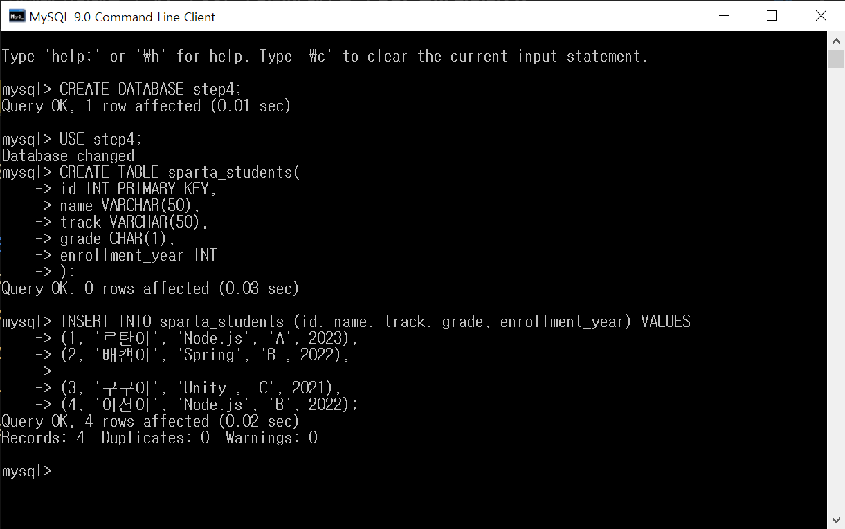INSERT INTO sparta_students (id, name, track, grade, enrollment_year) VALUES