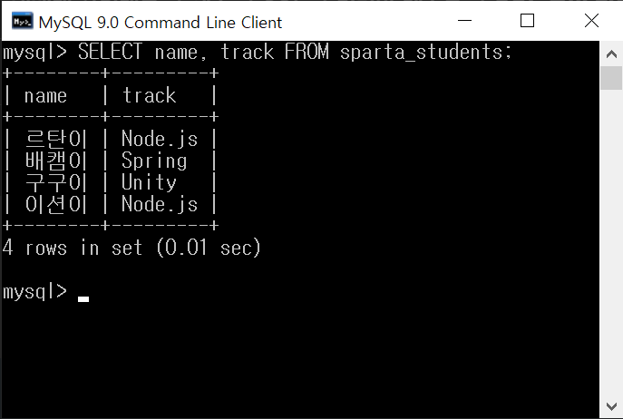 sparta_students테이블에서 모든 학생의 이름(name)과 트랙(track)을 선택하는 쿼리를 작성해주세요!