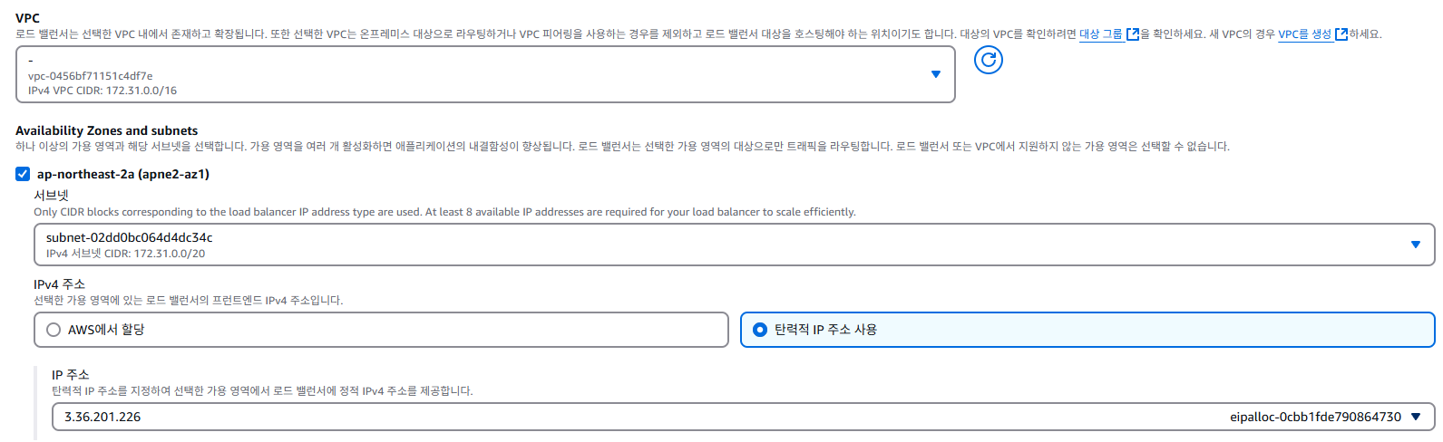 여기서 중요한 것은 EIP를 적용하기 위해 서브넷을 NLB와 동일한 것으로 선택해야 한다는 점.