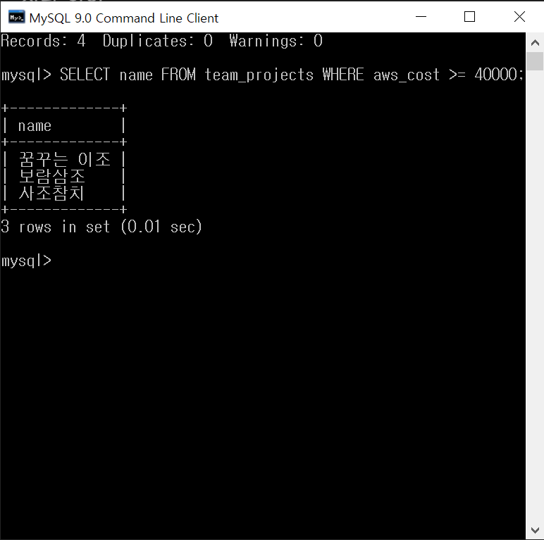 team_projects테이블에서 AWS 예산(aws_cost)이 40000 이상 들어간 프로젝트들의 이름을 선택하는 쿼리를 작성해주세요!