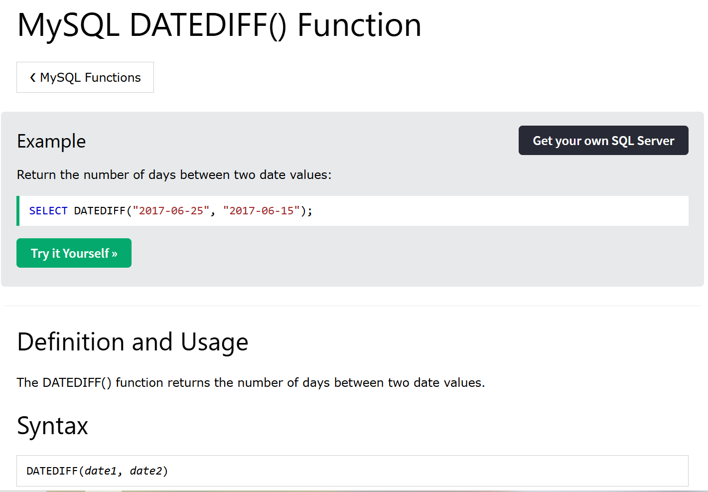 날짜 데이터끼리 덧셈 뺄셈이 가능하다는 건 앞선 퀘스트를 통해 확인한 바 있다. 그러나 날짜 간격을 어떻게 수치화할 수 있을까? 열심히 검색해본 결과 DATEDIFF() 함수를 이용할 수 있을 것 같다.