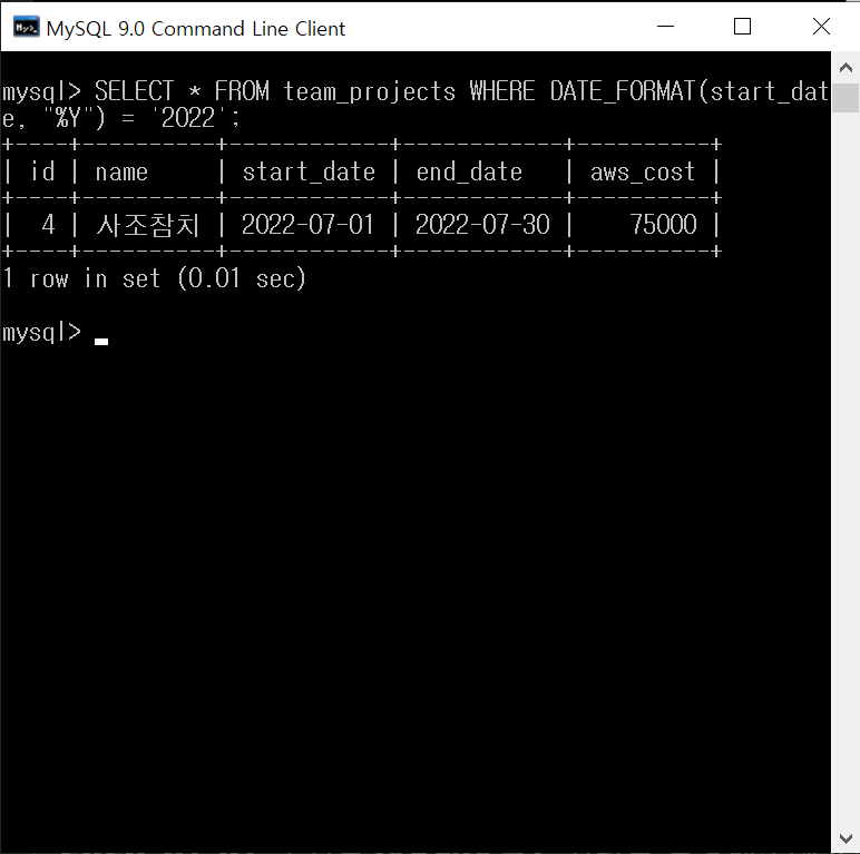 team_projects테이블에서 AWS 예산(aws_cost)이 40000 이상 들어간 프로젝트들의 이름을 선택하는 쿼리를 작성해주세요!team_projects테이블에서 2022년에 시작된 프로젝트를 선택하는 쿼리를 작성해주세요! 단, start_date < ‘2023-01-01’ 조건을 사용하지 말고 쿼리를 작성해주세요!team_projects테이블에서 현재 진행중인 프로젝트를 선택하는 쿼리를 작성해주세요. 단, 지금 시점의 날짜를 하드코딩해서 쿼리하지 말아주세요!team_projects테이블에서 각 프로젝트의 지속 기간을 일 수로 계산하는 쿼리를 작성해주세요!