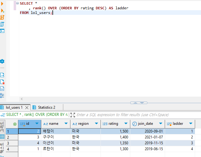 그 중에서 우리는 순위를 매겨주는 기능인 Rank를 이용하도록 하겠다. rating을 기준으로 순위를 매긴 뒤 해당 컬럼은 ladder라고 명명하겠다.(유저를 특정 그룹으로 나누려는 기준이 따로 없으므로, partition by 부분을 생략하였다.)