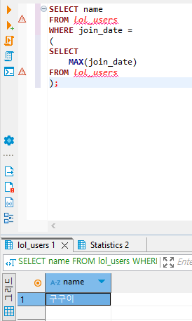 → 서브쿼리에서 MAX(join_date)를 구하고, 메인쿼리의 WHERE절을 통해 해당 값을 가진 레코드(행)를 선택하자.