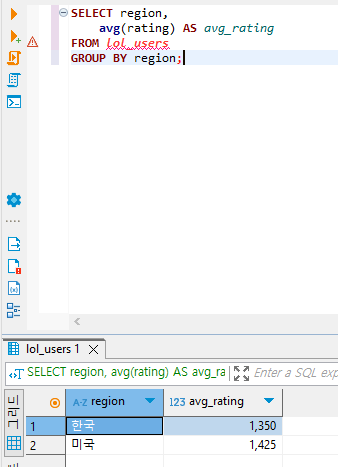 lol_users테이블에서 지역별로 평균 레이팅을 계산하는 쿼리를 작성해주세요!