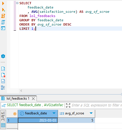 lol_feedbacks테이블에서 만족도 점수(satisfaction_score)에 따라 피드백을 내림차순으로 정렬하는 쿼리를 작성해주세요!lol_feedbacks테이블에서 각 유저별로 최신 피드백을 찾는 쿼리를 작성해주세요!lol_feedbacks테이블에서 만족도 점수가 5점인 피드백의 수를 계산하는 쿼리를 작성해주세요!lol_feedbacks테이블에서 가장 많은 피드백을 남긴 상위 3명의 고객을 찾는 쿼리를 작성해주세요!lol_feedbacks테이블에서 평균 만족도 점수가 가장 높은 날짜를 찾는 쿼리를 작성해주세요!