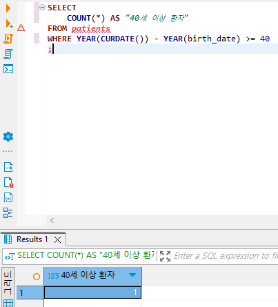 patients테이블에서 현재 나이가 40세 이상인 환자들의 수를 계산하는 쿼리를 작성해주세요!