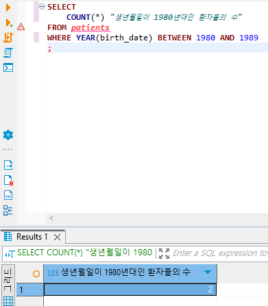 patients테이블에서 생년월일이 1980년대인 환자들의 수를 계산하는 쿼리를 작성해주세요!