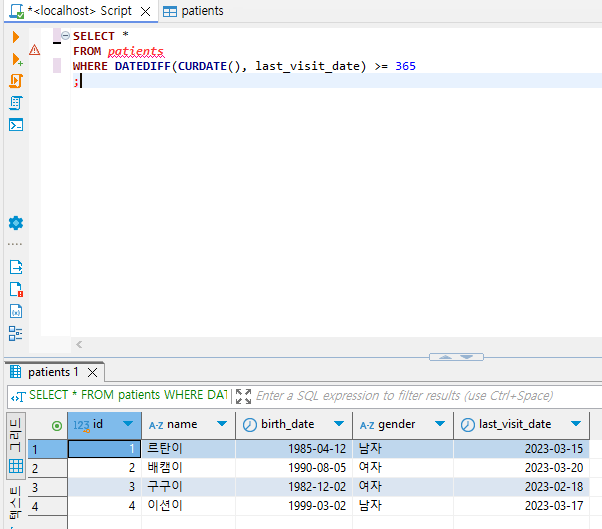 DATEDIFF(CURDATE(), last_visit_date) >= 365 인 레코드를 선택한다.