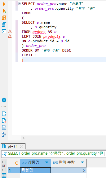 → 수량을 기준으로 내림차순으로 정렬한 후 LIMIT 1을 해준다.