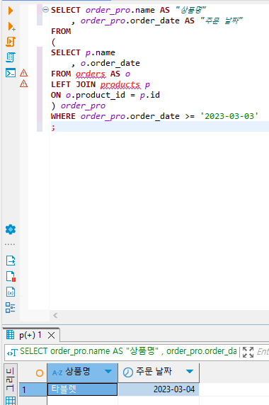 SELECT로 선택하는 필드 : products.name, orders.order_date