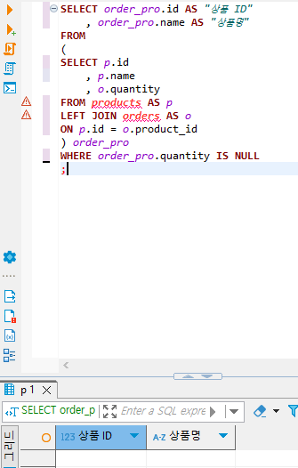 제품이 판매되지 않았다면 products 테이블을 기준으로 LEFT JOIN 했을 때 quantity의 값이 NULL일 것이라고 추측이 가능하다. 조건에 해당하는 레코드를 조회해야 한다.