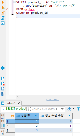 - 각 상품 ID별로 평균 주문 수량을 계산하는 쿼리를 작성해주세요!