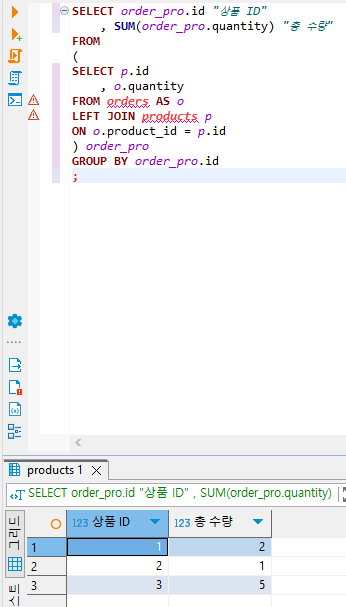 oders 테이블을 기준으로 LEFT JOIN(products.id, orders.quantity)