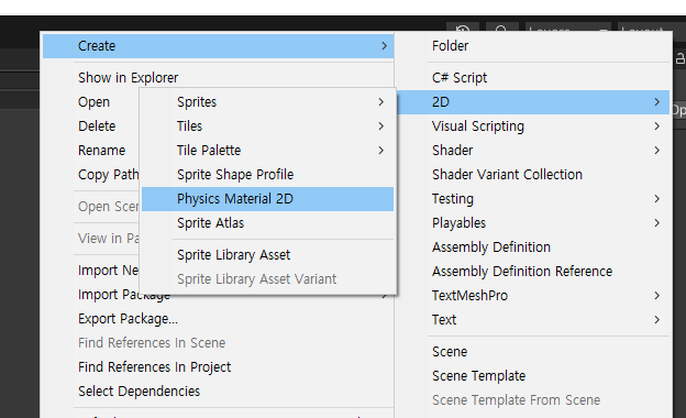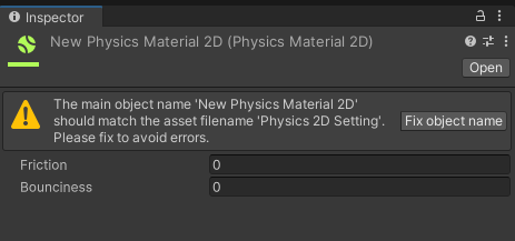 2D 오브젝트의 경우 Physics Material 2D을 생성하자.