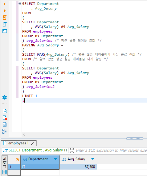 : HAVING Avg_Salary = (SELECT MAX(Avg_Salary) … )