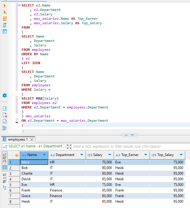 ON e1.Department = max_salaries.Department