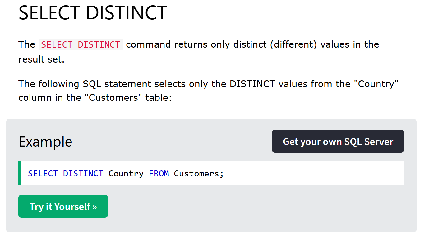 즉, DISTINCT 명령어는 중복되는 데이터들 사이에서 구별되는 값(Distinct values)들만 추려내는 명령어다.