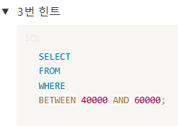 힌트를 확인 했을 때 BETWEEN 명령어를 사용하란 내용을 보게 되었다.