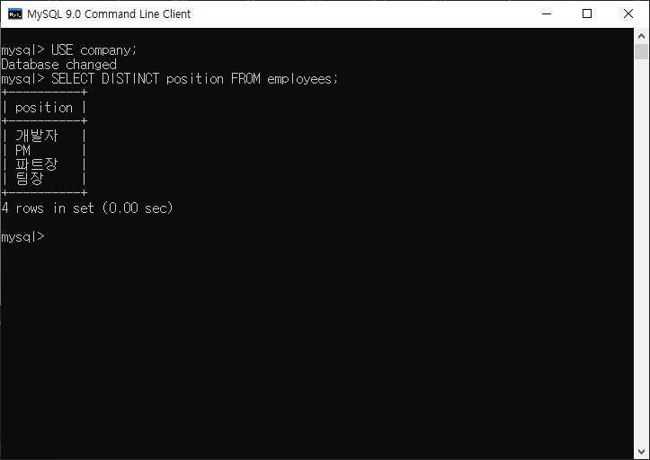 배운 것을 토대로 employees 테이블에서 중복 없이 모든 직급(position)을 선택할 수 있게 되었다.