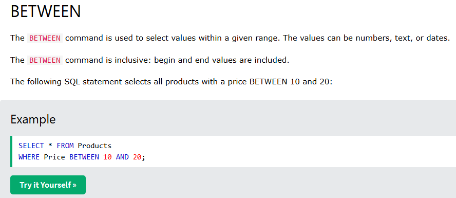 BETWEEN은 또 무엇일까? W3School의 도움을 받아보자.