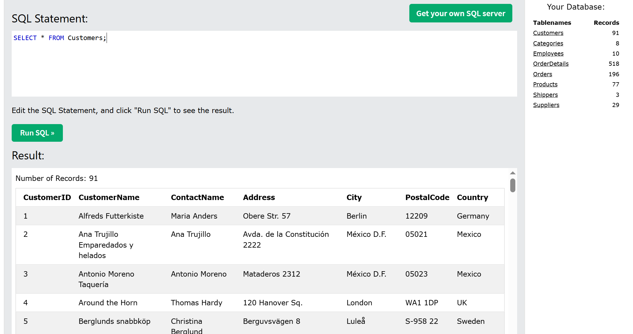 Customers라는 테이블 속에는 총 91명의 고객의 레코드가 들어있다.