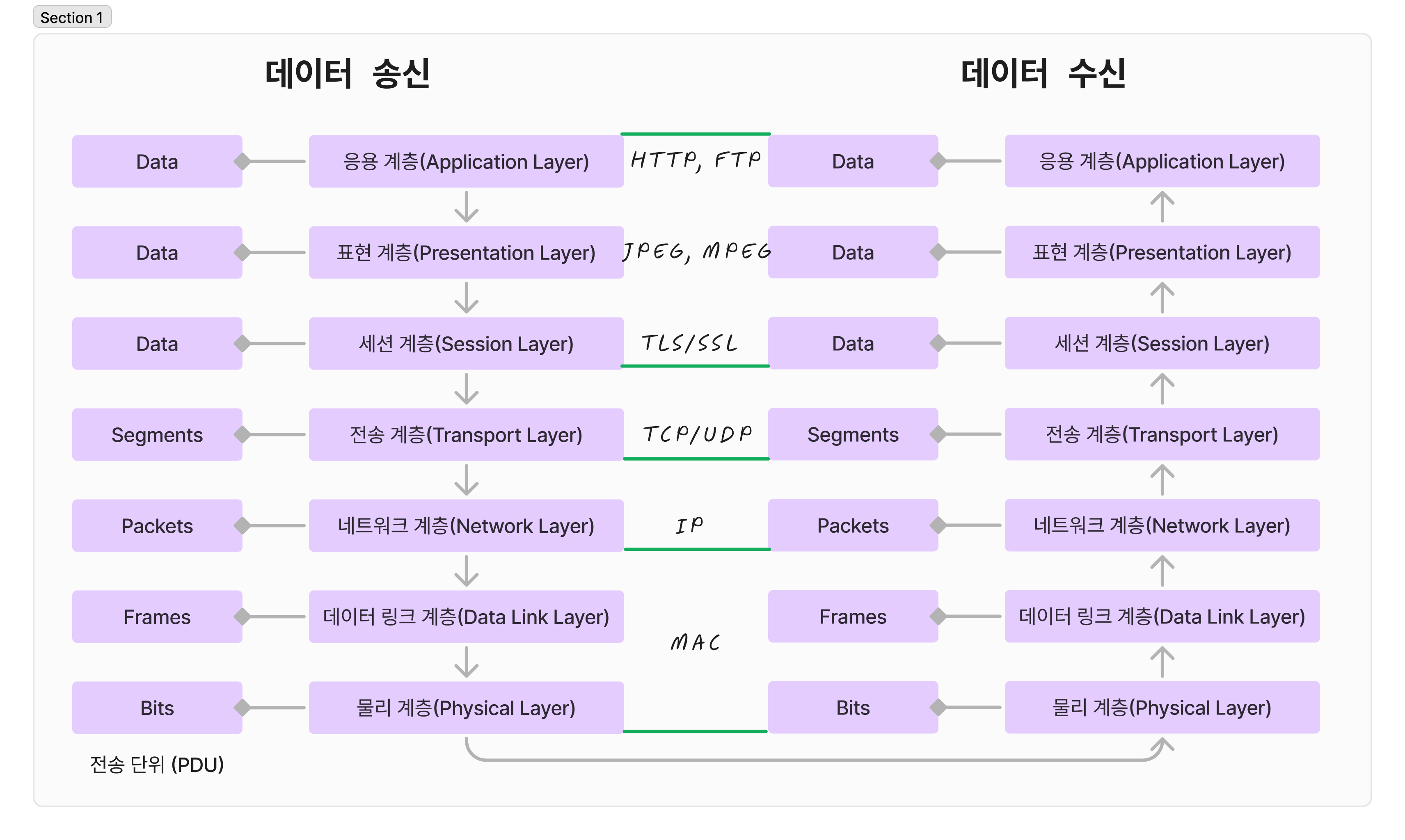 OSI 7계층의 핵심은 데이터를 분할하여 전송하고 재조립하여 수신하는 과정을 계층별로 나눌 수 있다는 점에 있다. 우리가 애플리케이션 레벨에서 보낸 이미지가 실제 케이블을 타고 1과 0의 전기 신호를 거쳐 다른 네트워크 장치에 도달하고, 비트 단위로 분할되었던 데이터가 원래의 이미지로 재구성되기까지. 이 과정이 바로 네트워크 통신이 이루어지는 모습이다.