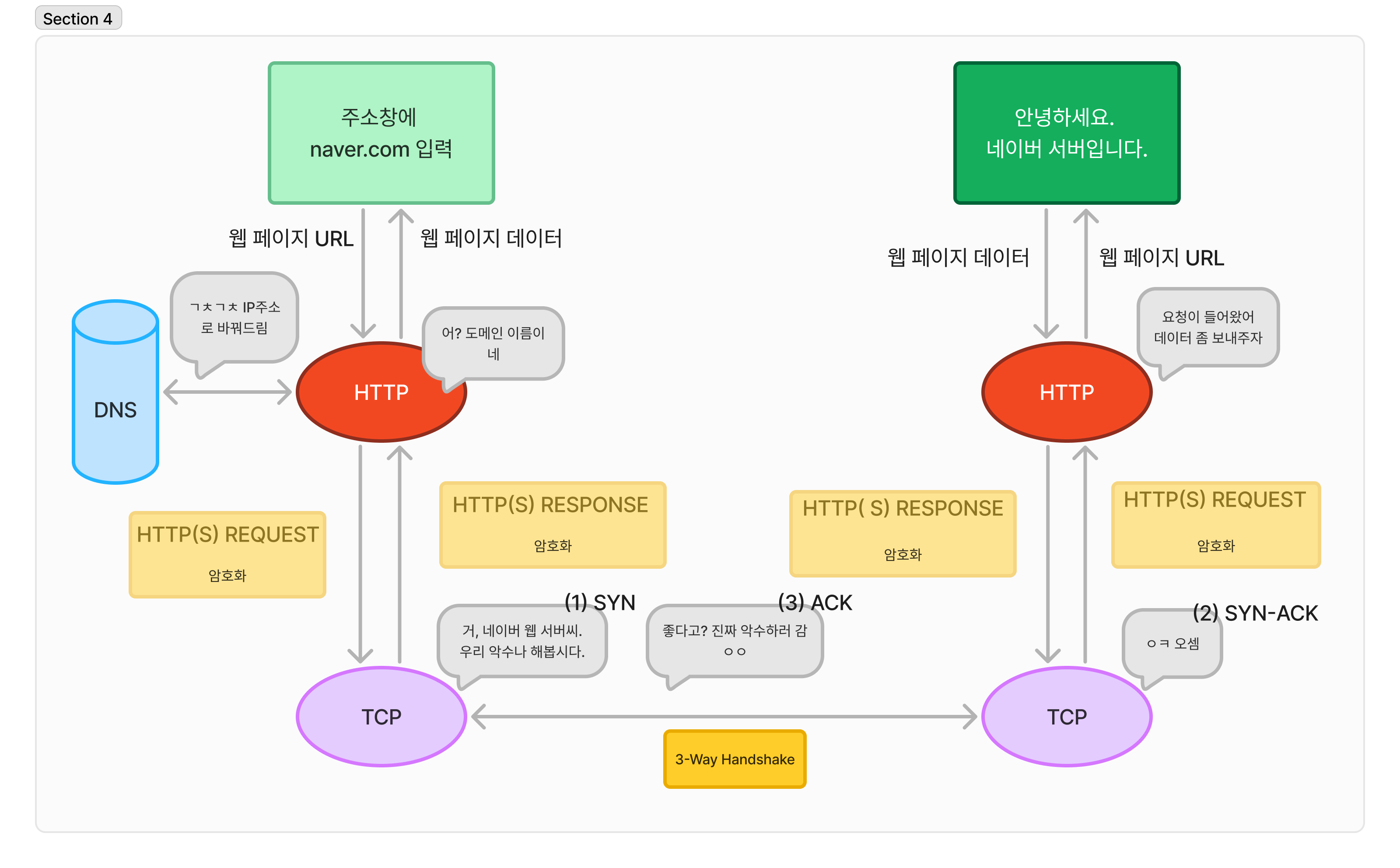 TCP 연결이 완료되면, 브라우저는 HTTP(S) 요청을 통해 네이버 서버에 정보를 요청한다.(HTTPS 프로토콜을 사용하는 경우, TLS/SSL 핸드셰이크를 이용해서 HTTPS라면 보안 채널을 설정하고 HTTP 요청이 암호화된 상태로 전송된다.)
