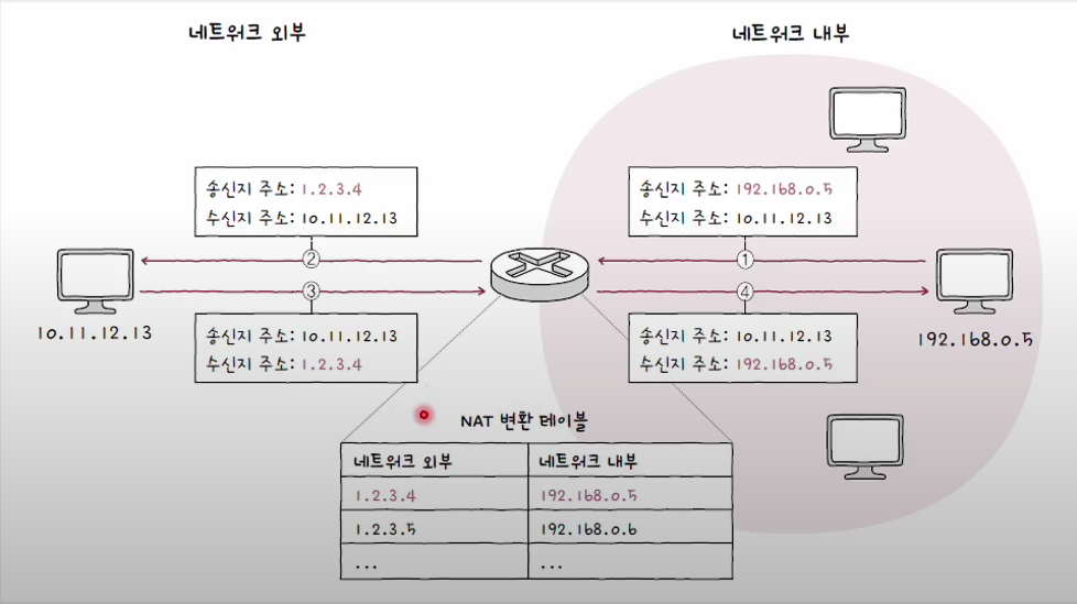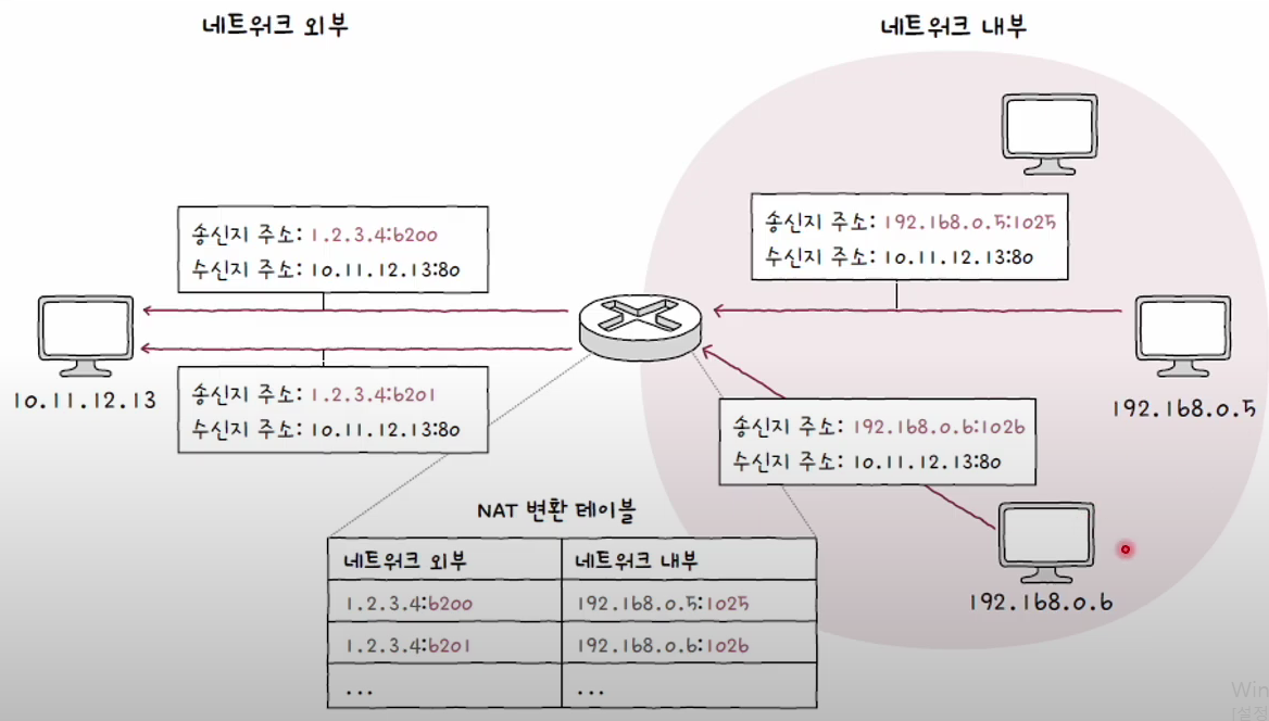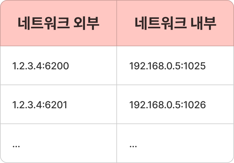 - 192.168.0.5와 192.168.0.6는 서로 다른 IP 주소를 가지고 있지만 외부 네트워크에서 같은 IP주소를 사용할 수 있다. 왜냐? 서로 다른 포트 번호를 사용하고 있기 때문!
