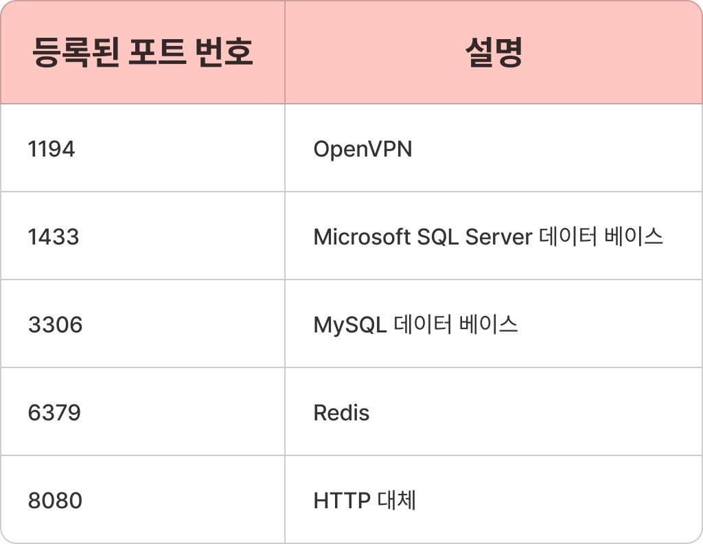 | 동적 포트(dynamic port) | 49152~65535 |
