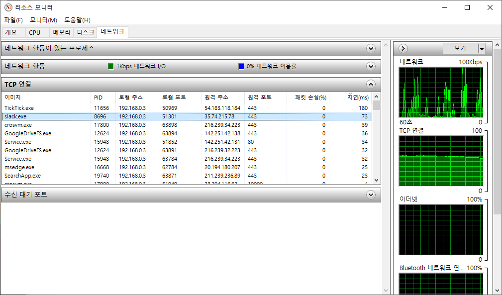 내 컴퓨터(192.168.0.3)의 슬랙 프로그램은 35.74.215.78호스트의 HTTPS라는 애플리케이션 프로세스와 통신 중!